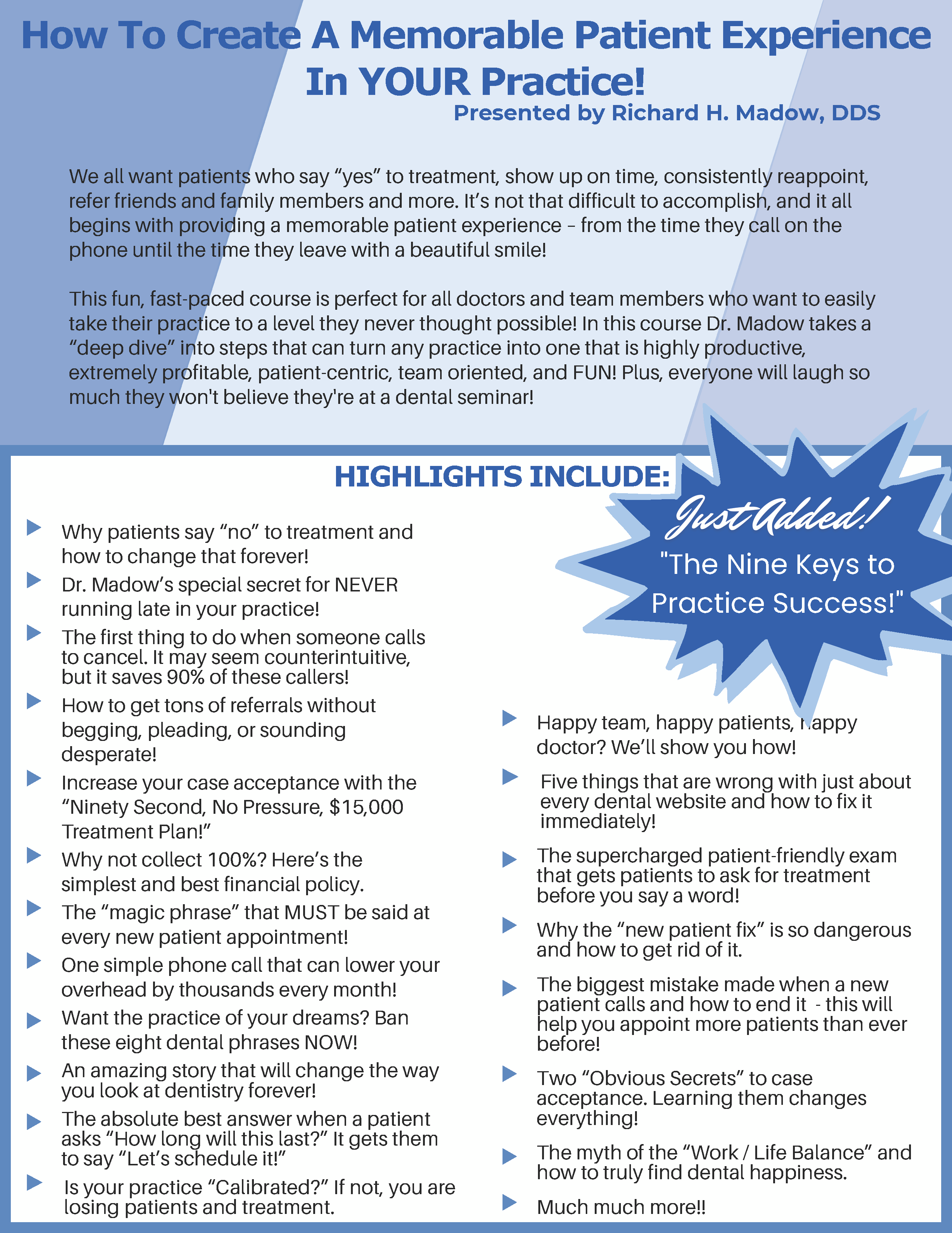 Since co-founding The Madow Center for Dental Practice Success in 1989, Dr. Richard Madow has been a trailblazer in helping dentists achieve unparalleled success and fulfillment in their practices. Recognized as a perennial “Leader in Dental Education” by Dentistry Today and a “Top Dental Consulting Provider” by Healthcare Business Review, Rich’s insights have reached over 100,000 dental practices worldwide through his highly influential publications, articles, and blogs.